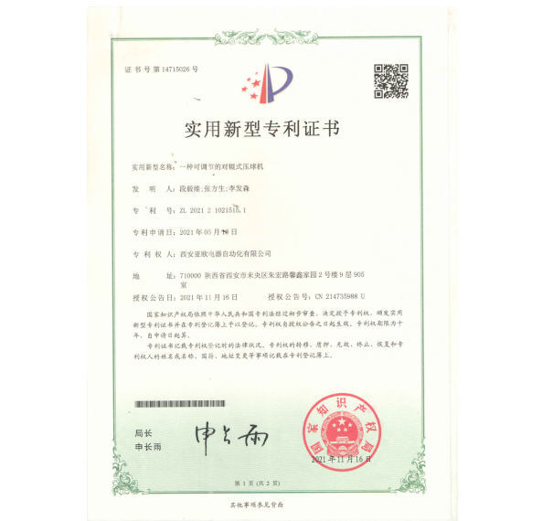 - 關于我們 - 資質(zhì)榮譽 - 一種可調(diào)節(jié)的對輥式壓球機
