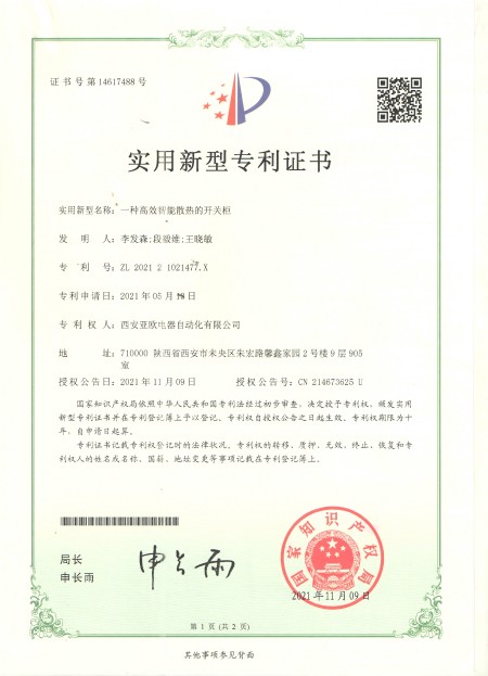 - 關(guān)于我們 - 資質(zhì)榮譽(yù) - 一種高效智能散熱開關(guān)柜專利